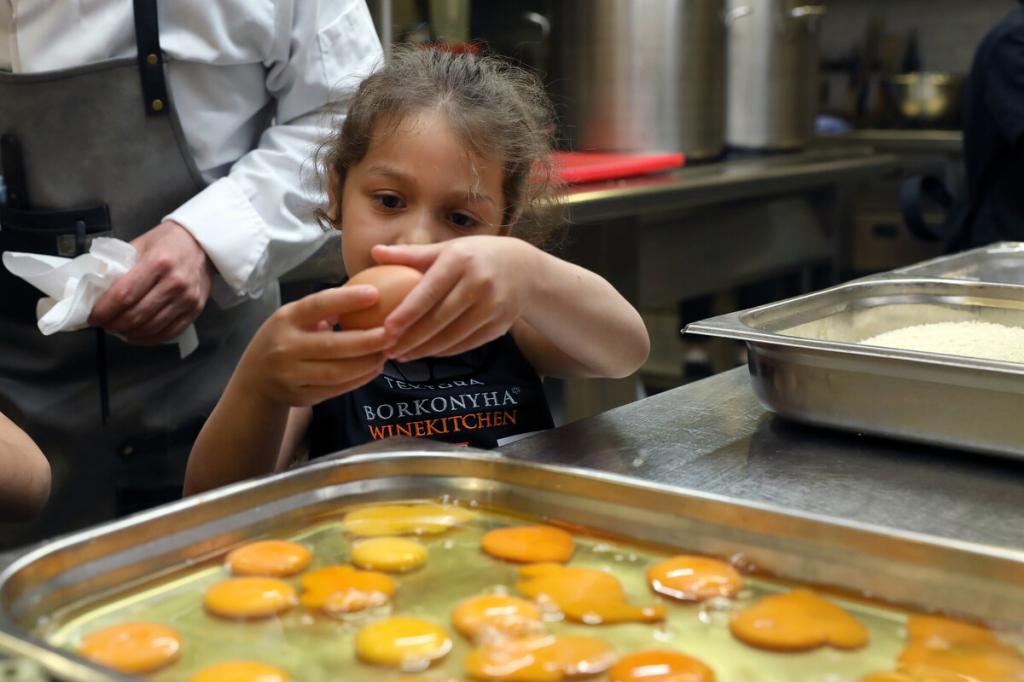 A munkának hamarosan neki is állnak, a konyhában minden gyereknek megvan a választott feladata: akad, aki a hússzeletek lisztezésére jelentkezik, más tojást tör egy nagy fém tepsibe, megint más a panírba mártja a lisztes-tojásos húsokat. Ezzel párhuzamosan a személyzet állandó, felnőtt tagjai is a konyhában sürögnek-forognak, ők már a déli nyitásra készülnek. A gyerekek szemmel láthatóan élvezik az ételkészítést. Gyorsan végeznek, így bőven marad idő egy kis körbevezetésre is. Ezt követően útjuk a cukrász részleghez vezet, mely egy külön helyiségben található. Itt besegítenek a Rákóczi túrósba: cukorból és vízből szirupot készítenek, majd megismerkednek a habzsák használatával is. A lelkes munka közben arra is futja, hogy meséljenek egy kicsit magukról. Spagetti, paradicsomleves, gyümölcsleves, paradicsomfőzelék, borsófőzelék(!) – ezek a kedvenc ételek hangzanak el többek között.