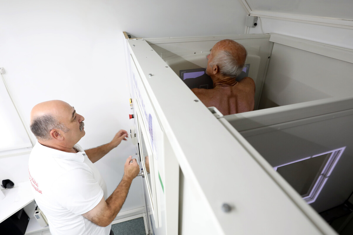 „A lakossági tüdőszűréseken mindig telt házzal üzemelünk, ma is 150-en jelentkeztek” – tudjuk meg tőle . „A vizsgálat pár perc alatt megvan: az elején adatfelvétel, utána mehet is a páciens a másik szobába, ahol vetkőző fülkék vannak, majd elkészül a mellkasröntgen a röntgen kabinban. A digitális felvételeket két tüdőgyógyász szakorvos értékeli ki, majd a leletek feltöltésre kerülnek az EESZT-be, amihez így a beteg, a foglalkozás egészségügyi szakorvos és a háziorvos is hozzáfér” – magyarázza.
