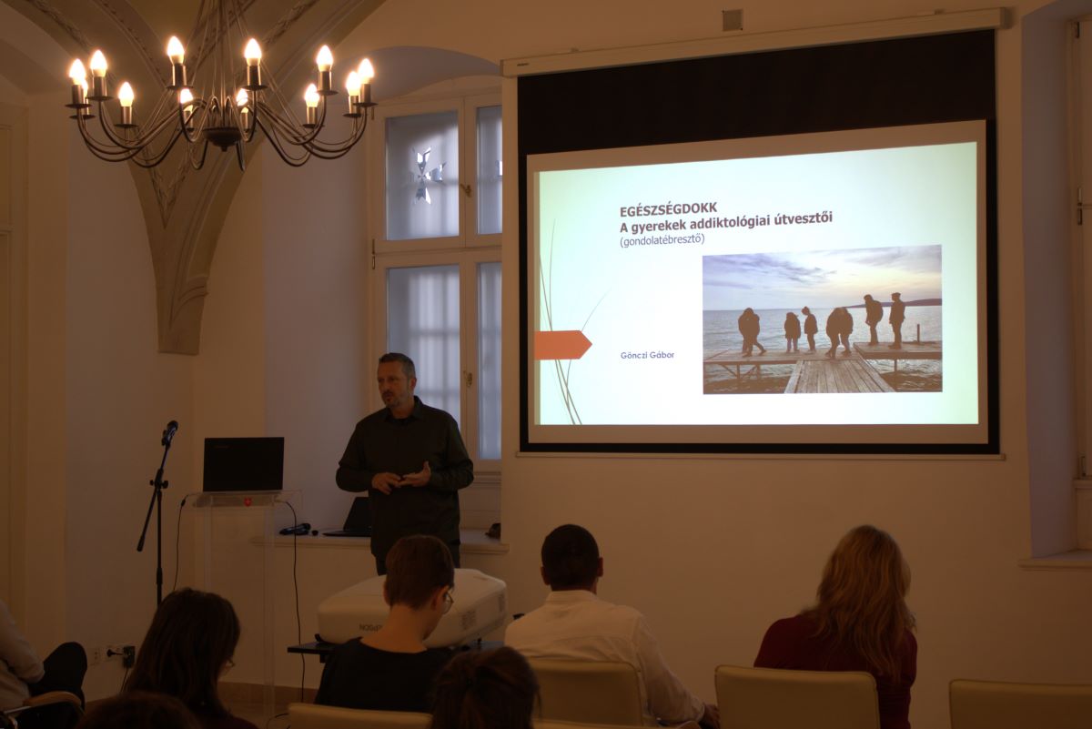 Gönczi Gábor, az Egészségdokk Alapítvány intézményvezetője gondolatébresztő előadásában a gyermekaddiktológia összetett és sokszor megrázó világába engedett betekintést. Mint fogalmazott, a gyermekek esetében egészen más megközelítésre van szükség, mint a felnőtteknél. Minden szenvedélybetegség kamaszkorban kezdődik, ám a gyermek „nem függő”, hanem önsértő és gyakran küzd az önszabályozás hiányával. Rámutatott arra is, hogy a lányok inkább érzelmi típusú terápiákra – például meseterápiára és kreatív módszerekre – reagálnak, míg a fiúk számára a csoportmunka, a példaképek és a strukturált keretek jelentenek kapaszkodót. Az ellátás során elkerülhetetlen az egészségügyi beavatkozás, a pszichológiai és pszichiátriai együttműködés, a pár- és családterápia pedig kötelező elem. Gábor hangsúlyozta: a gyermekaddiktológia még formálódó, önálló szakmaterület, amelyre jelenleg nincs elegendő felkészült szakember, ráadásul a gyermekek traumái a segítő felnőttek számára is komoly lelki és mentális megterhelést jelentenek. Előadását konkrét, sokszor sokkoló történetek és példák tették még érzékletesebbé, amelyek rávilágítottak a probléma súlyára és összetettségére.