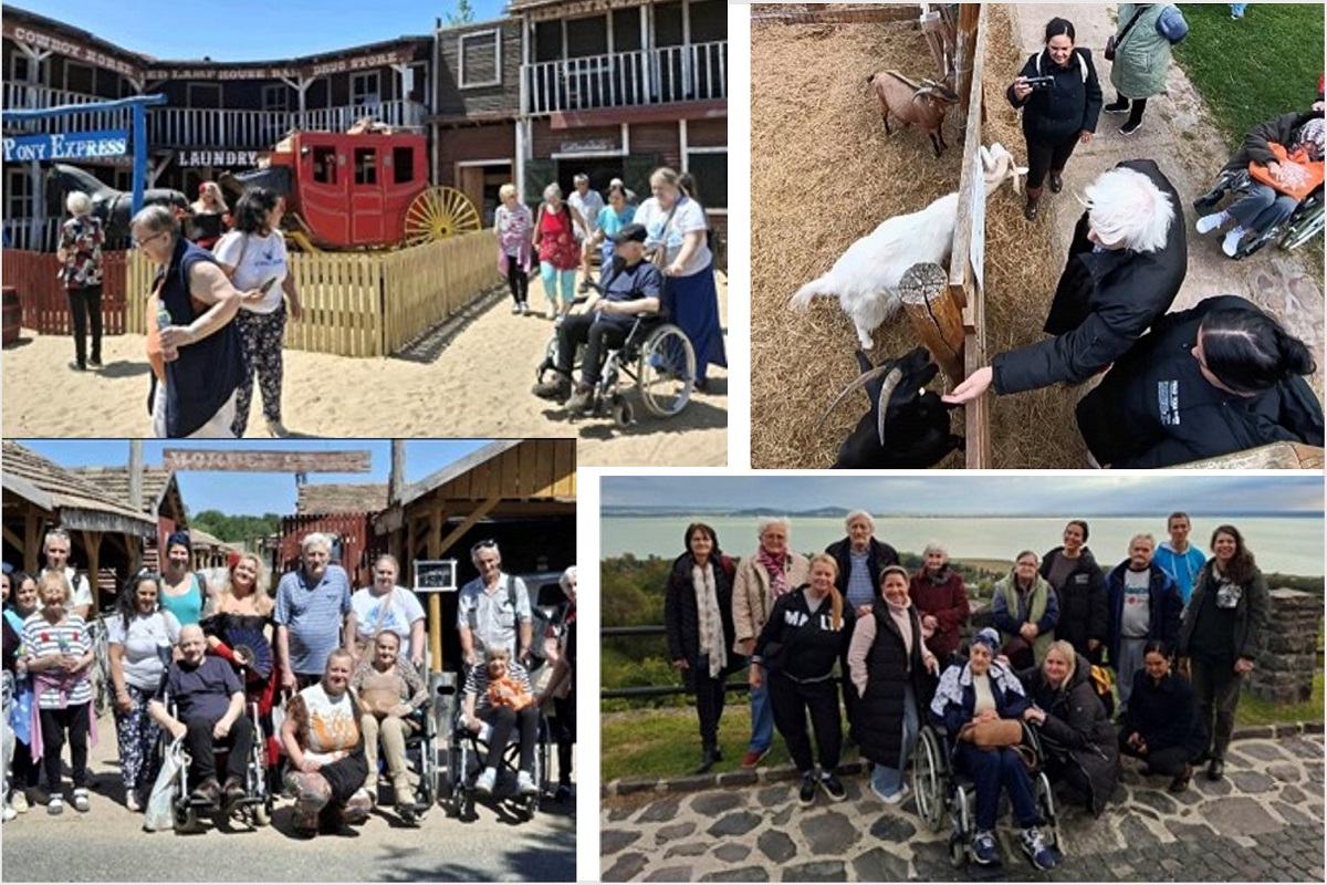 Egész napos kirándulásunkat 2025-ben a Káli-medencébe, Salföldre és Badacsonyba szerveztük. Ellátogattunk a Balaton-felvidéki Nemzeti Parkba, a Salföldi Majorba. Megnéztük a magyar háziállatokat, lakóink élvezetére kikocsikáztunk Salföldön keresztül az erdőbe, ahol a salföldi pálos kolostor romjai állnak. Ebédünket Kékkúton fogyasztottuk el, ahol ittunk a Kékkúti forrás vizéből is. Utunkat Badacsonyba folytattuk a Laposa borteraszra, ahol finom kapucsínó és kávé fogyasztása mellett gyönyörködhettünk az alattunk elterülő Balatonban. Tartalmas, szép kirándulás volt.