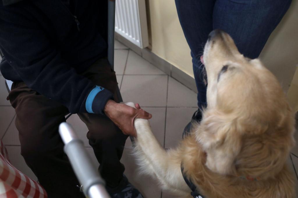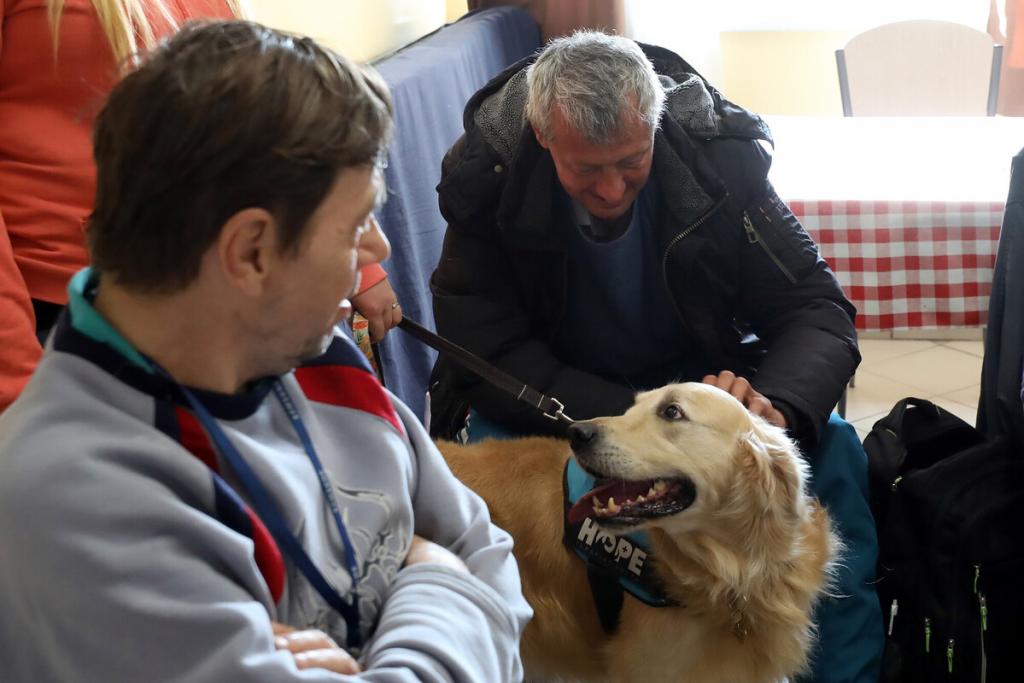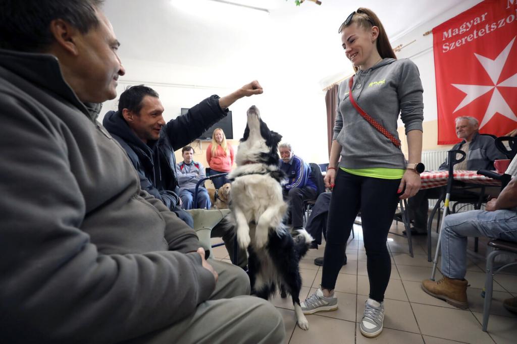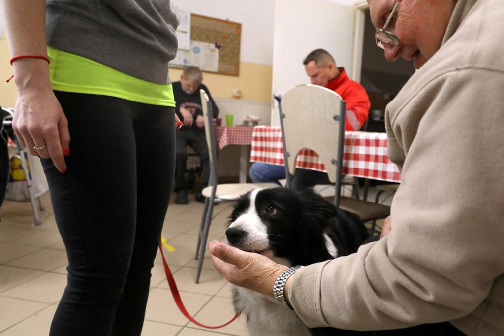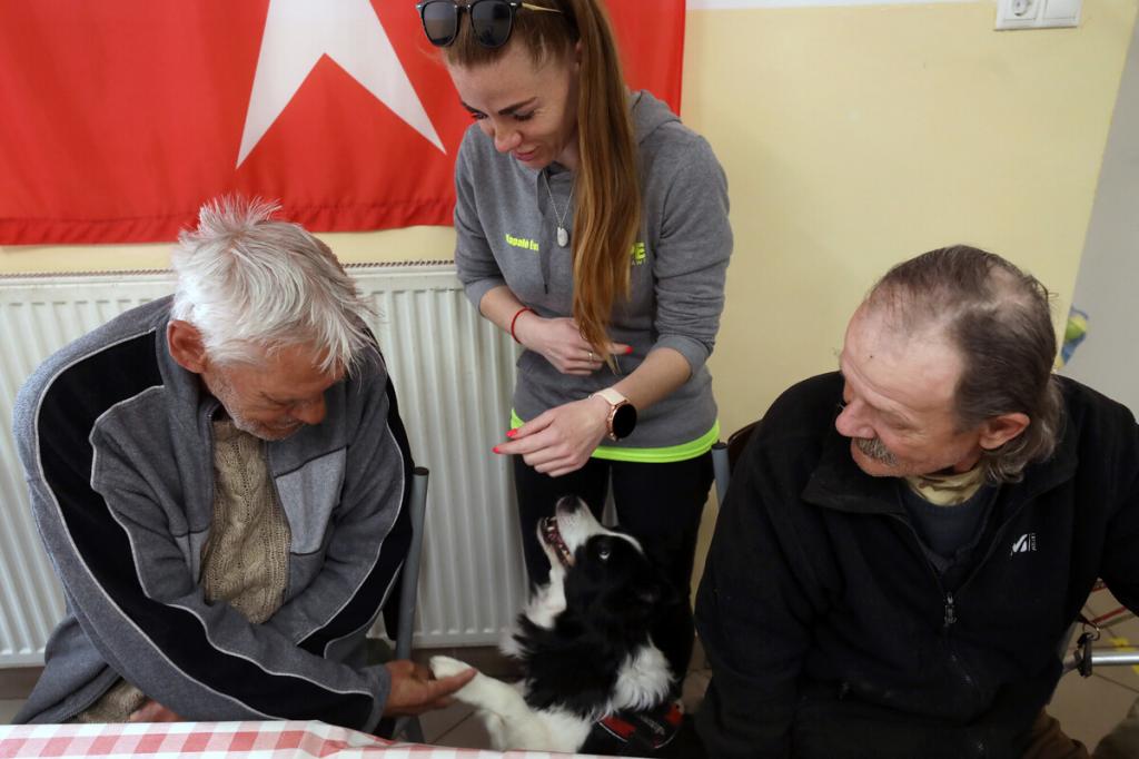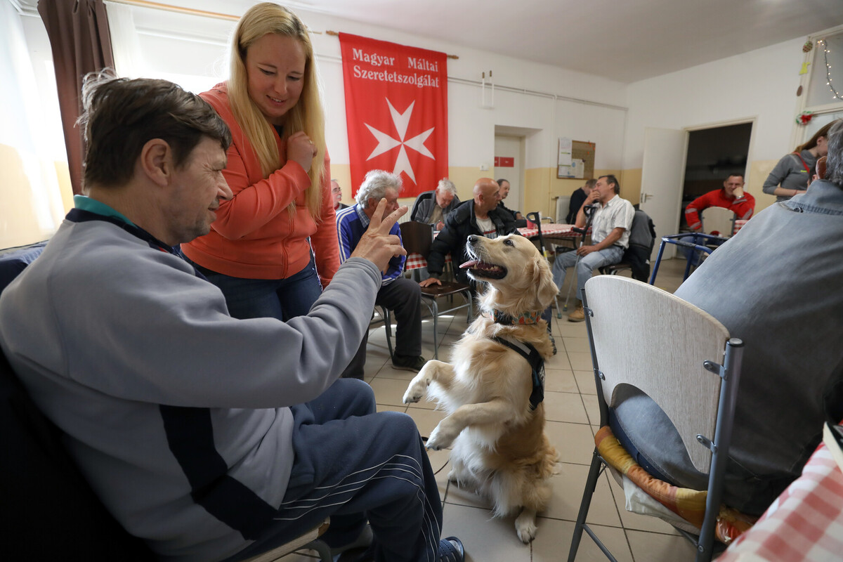 „Segítenének, kérem? Hamarosan jönnek a kutyusok. Toljuk szét az asztalokat, és csináljunk középen egy kört a székekből, így!” – Kaján Marietta terápiás munkatárs vidáman csengő hangja betölti a nappali melegedő étkezőjét, de csak kevesen mozdulnak meg rá. Bánattól, nehézségektől megkérgesedett szívű férfiak ülnek itt-ott, közömbös arccal merednek maguk elé, némelyikük mellett járókeret. Van köztük meglepően fiatal is, aki épp csak a negyvenes évei elején jár, az egyik lábát térdből amputálták. Lassan mégis megindul a mozgás, kialakul valahogy a kör a székekből, van, aki odaül, van, aki inkább hátrahúzódik, a fal mellé, látszólag nem érdekli a hamarosan kezdődő kutyaterápiás foglalkozás.