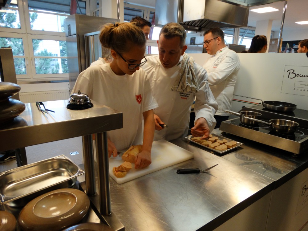 Az másik csapat kacsamáj előételt, hátszínt főételt készített, valamint – ahogy Sárközi Ákos séf mondta – egy kis nudlis desszerttel zártak. „Megérezhették a tanulók, milyen a verseny hangulat a konyhában. Megmutattunk sok számukra új fogást a főzés során is és a tálalásban is.” – tette hozzá a séf. A csapat egyetlen lány tagja kitörő örömmel fogadta, hogy Sárközi Ákossal dolgozhat együtt a délelőtt folyamán, mert nagy rajongója a séfnek. „Még sosem csináltam ilyeneket, amiket ma kellett, de nagyon jó volt kipróbálni és ezekkel az emberekkel együtt dolgozni.” – mondta Buresch Evelin.