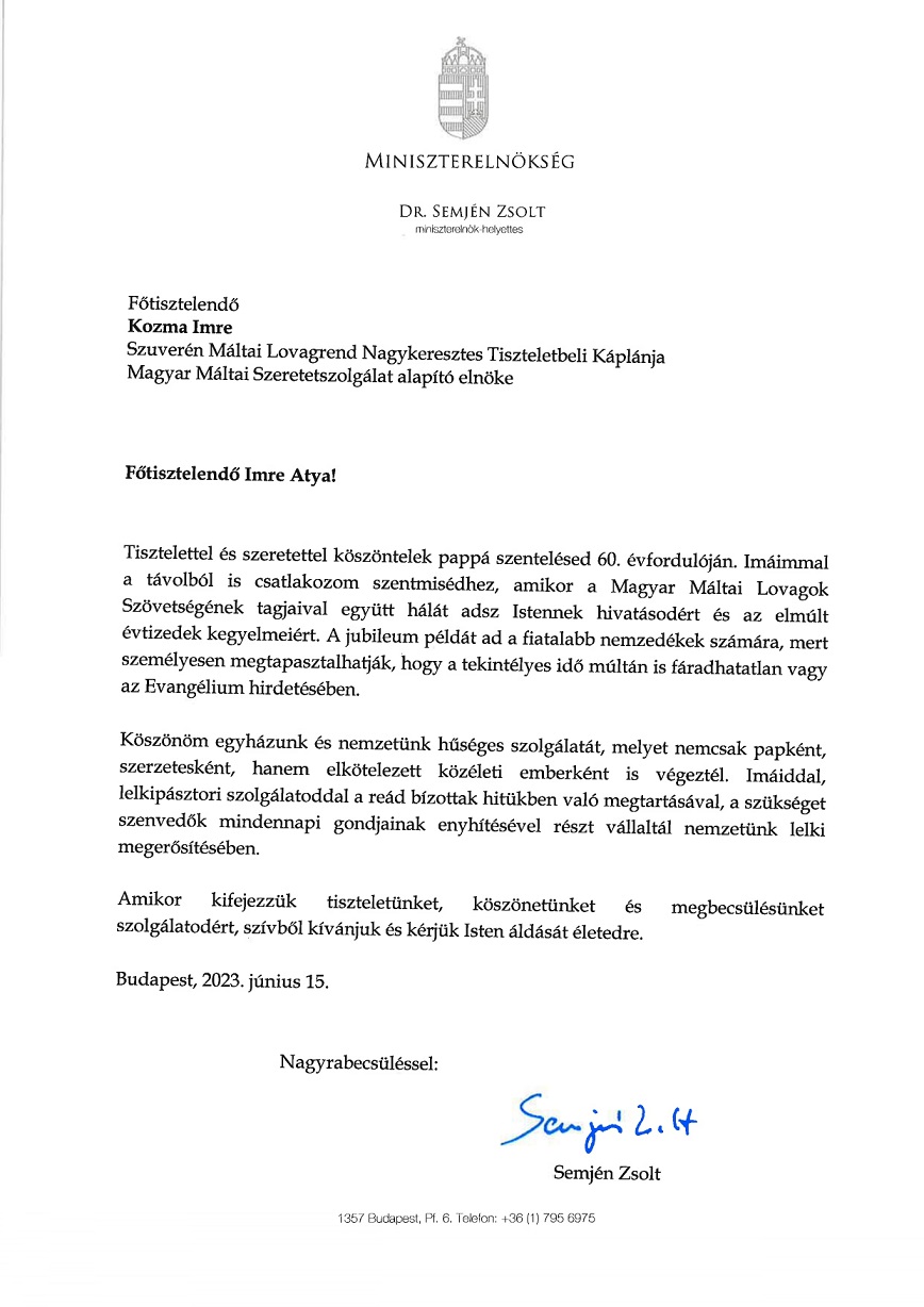 „Imáiddal, lelkipásztori szolgálatoddal, a reád bízottak hitükben való megtartásával, a szükséget szenvedők mindennapi gondjainak enyhítésével részt vállaltál nemzetünk lelki megerősítésében” – fogalmazott Semjén Zsolt miniszterelnök-helyettes a Kozma Imrét köszöntő írásában.