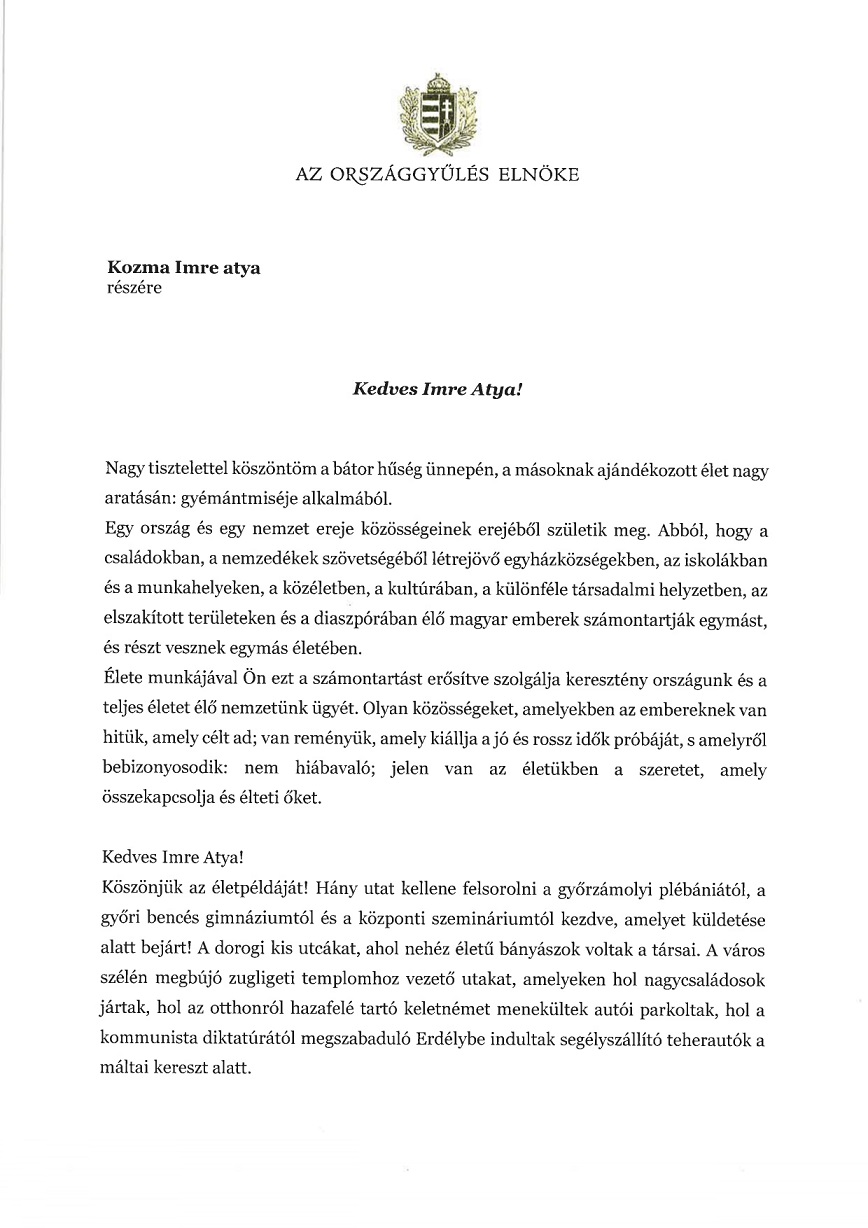 A „bátor hűség ünnepén, a másoknak ajándékozott élet nagy aratásán” köszöntötte Kövér László, az Országgyűlés elnöke Kozma Imre atyát. A szerzetes papi pályafutásának főbb állomásainak felidézését követően a házelnök köszönetet mondott Kozma Imre jóra való bátorságáért és elkötelezettségéért, az Isten ügye iránti töretlen hűségéért.