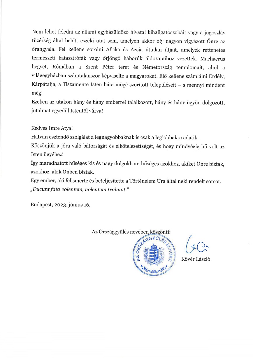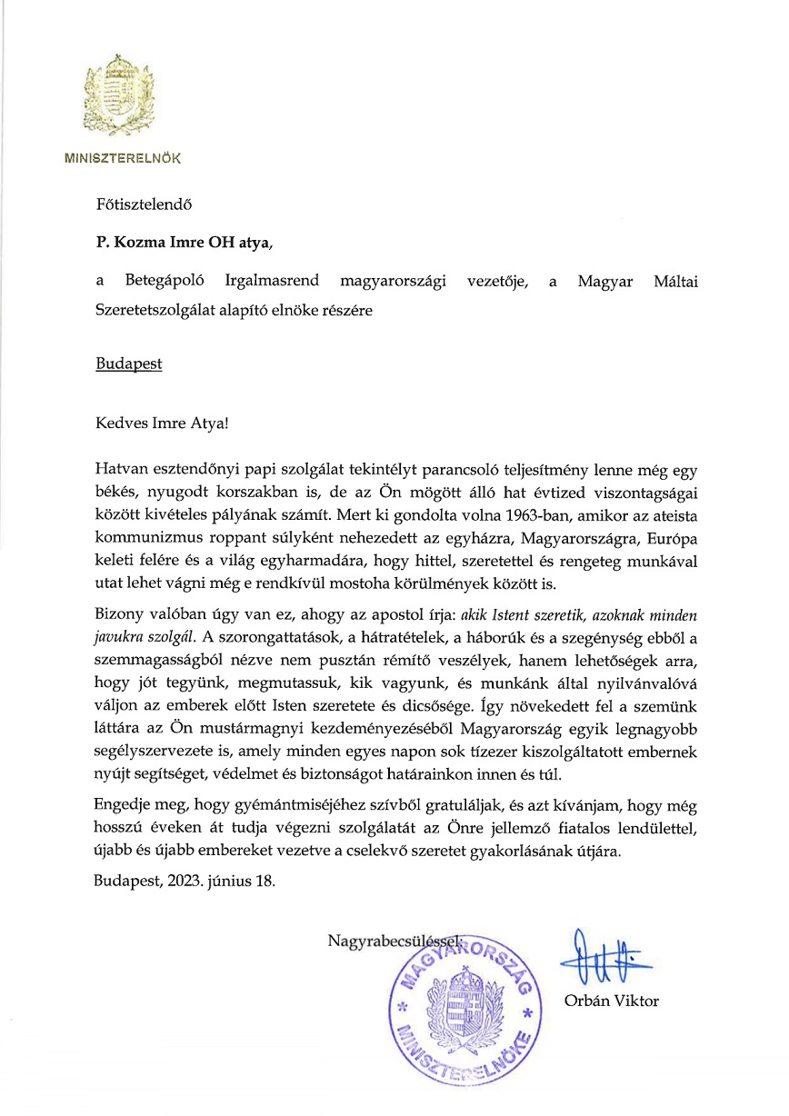 „A szorongattatások, a hátratételek, a háborúk és a szegénység ebből a szemmagasságból nézve nem pusztán rémítő veszélyek, hanem lehetőségek arra, hogy jót tegyünk (…) Engedje meg, hogy gyémántmiséjéhez szívből gratuláljak, és azt kívánjam, hogy még hosszú éveken át tudja végezni szolgálatát az Önre jellemző fiatalos lendülettel, újabb és újabb embereket vezetve a cselekvő szeretet gyakorlásának útjára” – írta levelében Orbán Viktor miniszterelnök.