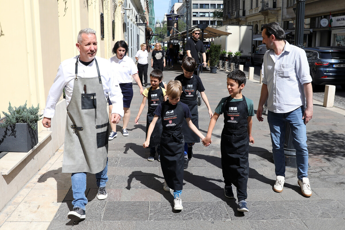 Délelőtt háromnegyed tíz, Sas utca. A pesti belváros egyik központi helyén vagyunk, a Szent István Bazilika szomszédságában. Hamarosan rendhagyó társaság érkezik a Textúra étterembe: ötfős gyerekcsapat és kísérőik, Kecskemétről, a családok átmeneti otthonából. Egyikük, még óvodás, a többiek már iskolába járnak. A csapatot Sárközi Ákos köszönti, aki úgy tűnik, hamar megtalálja velük a közös hangot. Ha volt is izgalom az érkező gyerekek részéről, az gyorsan elpárolog. Rövid ismerkedés és gyors kézmosás után a séf bevezeti őket birodalmába, ahol először közösen készítik el a tízórait: melegszendvicset, sok sajttal. Persze csak miután minden kis kukta megkapja a saját, külön erre az alkalomra készített konyhai kötényét. A kenyérkenést és sajtszórást sugárzó tekintetek kísérik, megilletődöttségnek már nyoma sincs. Hamarosan együtt majszolják munkájuk eredményét.