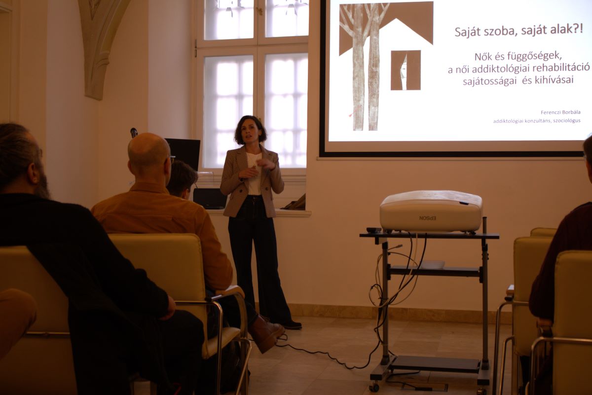 A női addiktológiai rehabilitáció sajátosságairól Ferenczi Borbála addiktológiai konzultáns, szociológus beszélt „Saját szoba, saját alak?!” című előadásában. A női szerepekkel kapcsolatos társadalmi elvárásokat a nők valós helyzetével állította szembe, megemlítve többek között a 17,8%-os bérszakadékot, valamint azt, hogy a nők mintegy 30 százaléka élt már át fizikai és/vagy szexuális erőszakot. Kiemelte, hogy a nőknél a bűntudat a szociális kontroll egyik legerősebb formája, és ez szorosan összefügg az érzelmek – például a düh és a harag – elfojtásával vagy kimondhatatlanságával. Előadásában szó esett a női szerhasználat hátteréről és következményeiről, a havi ciklus és az életciklus sajátosságairól, valamint a női identitás és lelki élet alakulásáról is.
