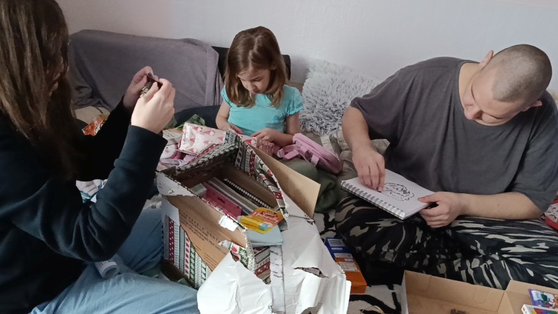 A sok család mellé mindig összegyűlik a sok adományozó is. Néhány évvel ezelőtt jelentkezett egy nagyobb intézmény és azóta is élő a kapcsolat. Az ott dolgozók 2025 karácsonya előtt is felajánlották, hogy 18 családot ajándékoznának meg, személyre szólóan. Nagy lehetőség ez, lehet kérni akár különlegesebb dolgokat, ha szükség van rá, például airfryert, kenyérsütőt, húsdarálót. Pálinkás Orsolya levelezik a családokkal, ennek során kiderül, ki mit szeretne kapni, az ajándékozók olykor vissza is kérdeznek, nehogy például más mintás ágyneműt vegyenek, mint amire vágynak a gyerekek. Gyönyörűen becsomagolják a dobozokat, szalagot is tesznek, rá, feliratozzák. 56 csomagot készítettek a 18 családnak, hiszen több vágyuk is volt, lehet, hogy kértek mindenkinek cipőt vagy szabadidőruhát, és még tányért, poharat, fejlesztőjátékot… Ha szárítóállványt kér valaki, azt is szépen becsomagolják.