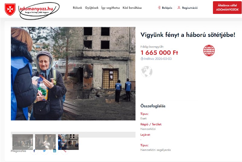 Vigyünk fényt a háború sötétjébe! felhívással indította el a gyűjtést március közepén Morva Emília, a Szeretetszolgálat közép-magyarországi régióvezetője a máltai munkatársak és önkéntesek körében. „A szeretet nem szavakban, hanem tettekben mutatkozik meg. Ezt tanította nekünk Kozma Imre atya. Különösen fontos számunkra, hogy most nem mi kértünk másoktól, hanem mi adhattunk. Az adományaink kézzelfogható segítséget jelentenek az apa nélkül maradt családoknak és a magányos időseknek. Ez a felajánlás a közösségünk erejének látható jele.”