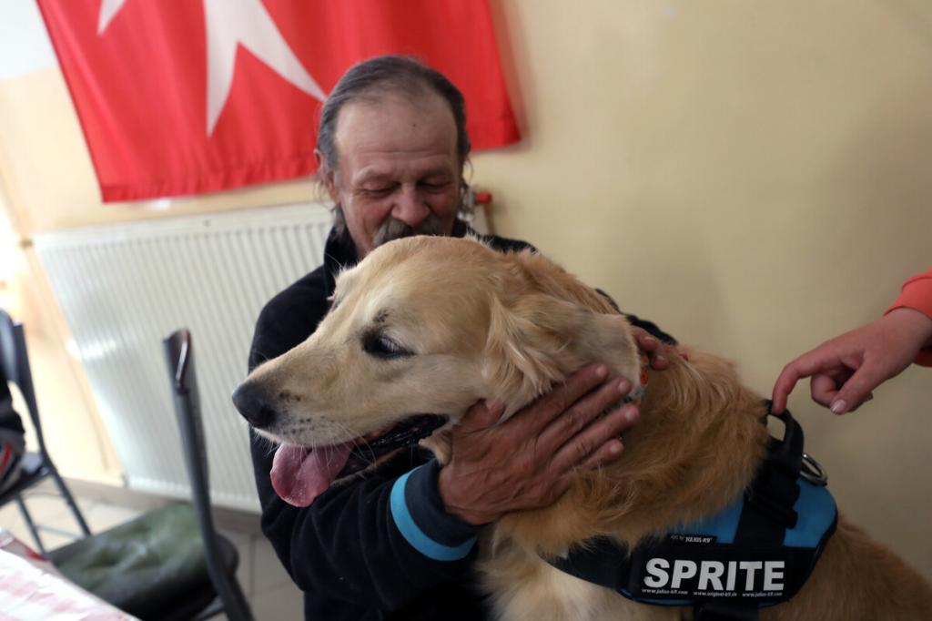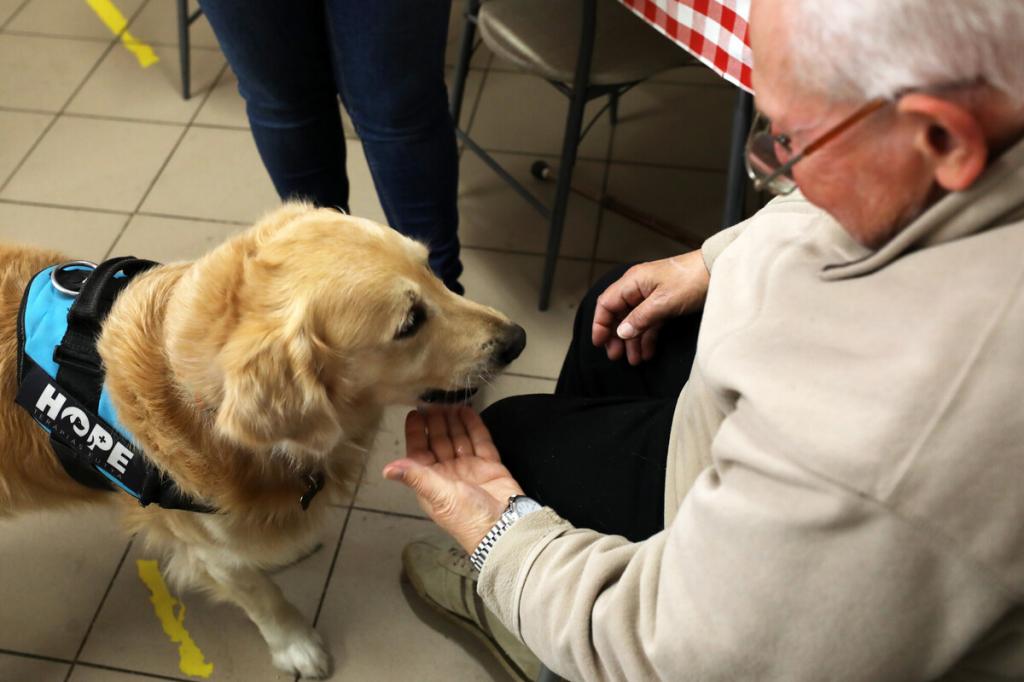 Nem kell sokat várni, nagy farkcsóválással érkezik Sprite, a kilencéves golden retriever, és a szintén kilencéves border collie, Flow. A HOPE mentő- és segítőkutyás egyesület képzett kollégái ők, nagy tapasztalatuk van, hogyan vidítsák fel a körülöttük lévőket, gazdáikkal, Orosz Emesével és Kapaló Évával rendszeresen járnak óvodákba, kórházakba, hospice ellátásba is. Nem hozza zavarba őket a látszólagos közöny, lelkesen várják, hogy megmutathassák, mit tudnak, és megkapják érte a jutalmukat, egy-egy finom falatot, és mellé a simogatást.
