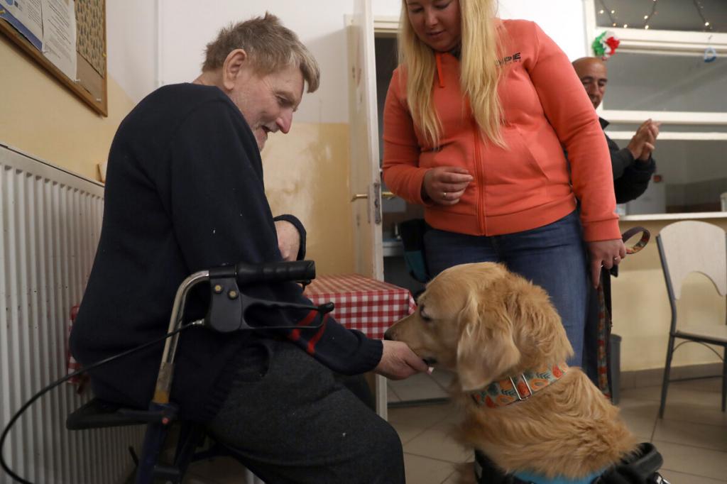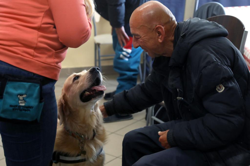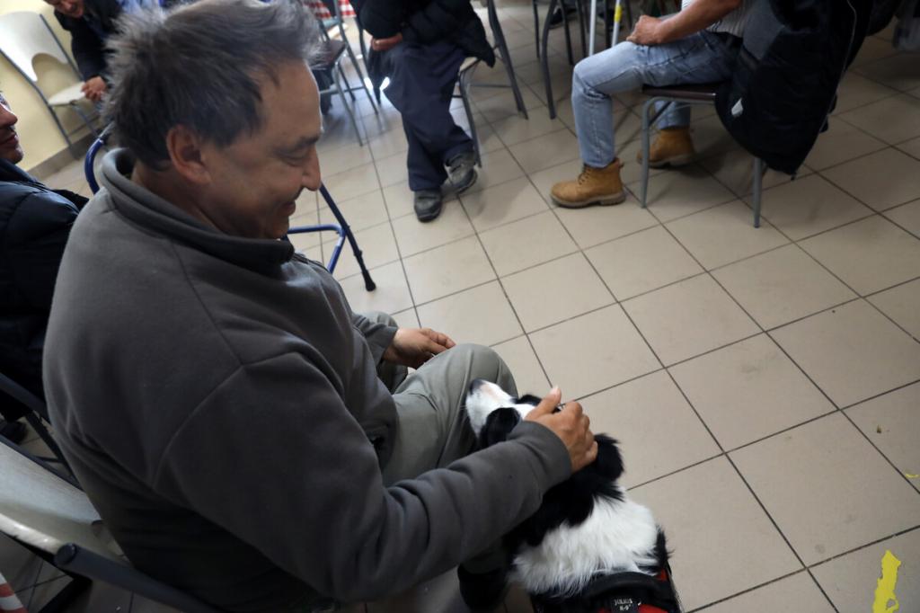 „Segítenének, kérem? Hamarosan jönnek a kutyusok. Toljuk szét az asztalokat, és csináljunk középen egy kört a székekből, így!” – Kaján Marietta terápiás munkatárs vidáman csengő hangja betölti a nappali melegedő étkezőjét, de csak kevesen mozdulnak meg rá. Bánattól, nehézségektől megkérgesedett szívű férfiak ülnek itt-ott, közömbös arccal merednek maguk elé, némelyikük mellett járókeret. Van köztük meglepően fiatal is, aki épp csak a negyvenes évei elején jár, az egyik lábát térdből amputálták. Lassan mégis megindul a mozgás, kialakul valahogy a kör a székekből, van, aki odaül, van, aki inkább hátrahúzódik, a fal mellé, látszólag nem érdekli a hamarosan kezdődő kutyaterápiás foglalkozás.